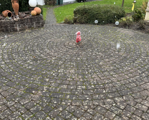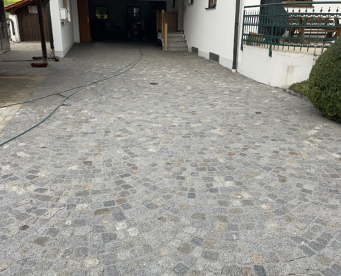 Für zusätzliche Stabilität und eine dauerhaft ansprechende Optik wird die Fläche abschließend imprägniert. Diese hochwertige Imprägnierung schützt zuverlässig vor Feuchtigkeit, Schmutz und Öl, reduziert die Bildung von Grünbelag und lässt Wasser einfach abperlen. Das Pflaster bleibt atmungsaktiv, widerstandsfähig und deutlich pflegeleichter – ideal für stark genutzte Außenflächen.