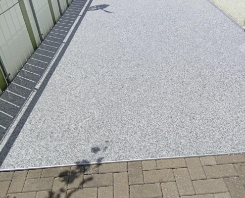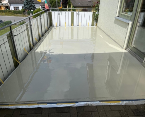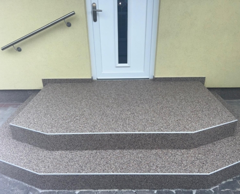 Vor der Verlegung bereitet Gröner Sanierungen die Flächen professionell vor: nivelliert, dichtet ab und sorgt für eine optimale Haftung. Anschließend werden hochwertige Marmorsteinchen mit einem lösemittelfreien, geruchlosen Bindemittel vermischt und fugenlos in einer Schicht von 6–10 mm aufgetragen. Die Verarbeitung erfolgt sauber, staubfrei und präzise – bereits nach 12–24 Stunden ist die Fläche wieder begehbar.